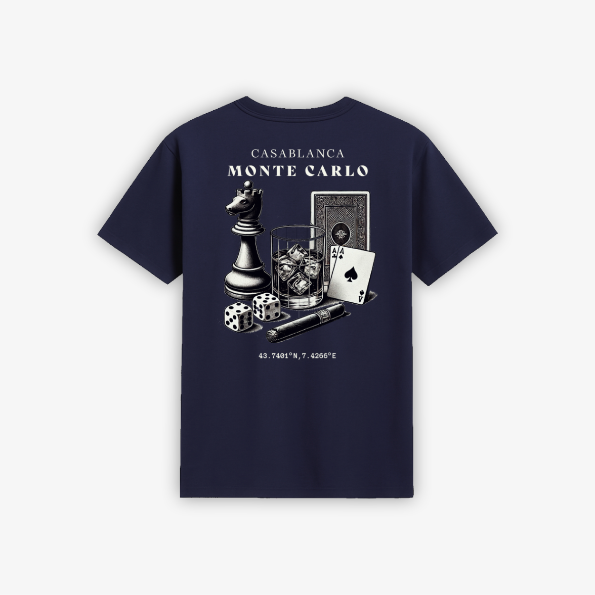 The Monte Carlo T-Shirt captures the intrigue of Monte Carlo nights, where smoke curls through the air, glasses clink softly, and every glance feels like a game of strategy. With a backprint featuring iconic symbols of leisure and taste, this piece belongs to the man who never plays loud, only well.